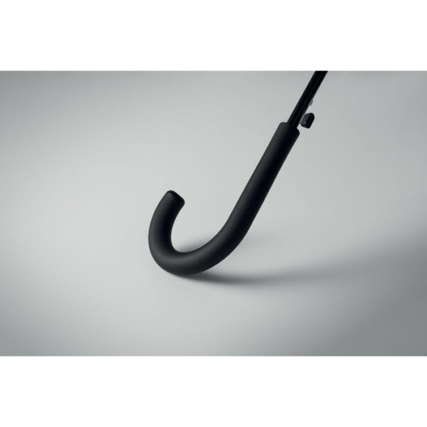 23 inch straight auto open windproof umbrella with full fibreglass frame and panels in 190T pongee fabric. Plastic tips and top. Rubberized PP plastic curved handle. Manual closure.