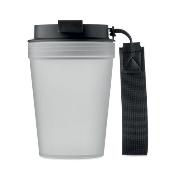 Single wall tumbler in PP, with RPET polyester strap. Leak-free. Capacity: 300 ml. As this is a single walled tumbler, heat transfer can still occur.