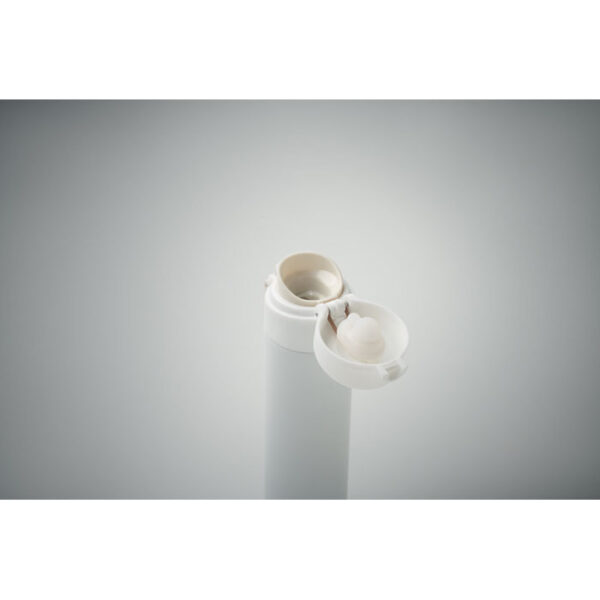 Double wall drinking bottle in recycled stainless steel (90% recycled stainless steel and 10% stainless steel) with security lock on the lid and press-to-open option. Leak free. Capacity: 300ml.