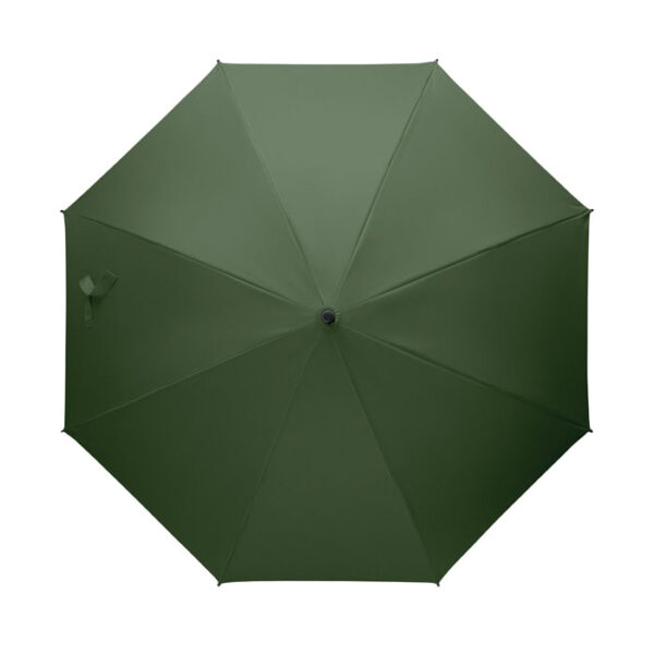 23 inch straight auto open umbrella with black plating metal frame, fibreglass ribs and panels in 190T pongee fabric. Plastic tips and top. Rubberized PP plastic curved handle. Manual closure.