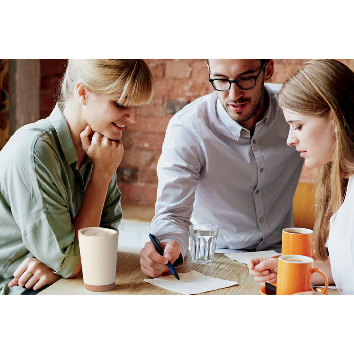 Ποτήρι διπλού τοιχώματος σε PP με βάση από φελλό και κάλυμμα επιστόμιου πόσιμου κλεισίματος ολίσθησης σε PS και ABS. Χωρητικότητα: 300 ml.