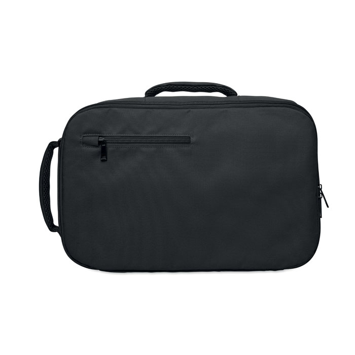 “Cabin-size carry-on extendable backpack made of 600D RPET polyester with 180o opening. Features a main compartment with two open sections, mesh division, padded 15″” laptop pocket, and luggage strap.”