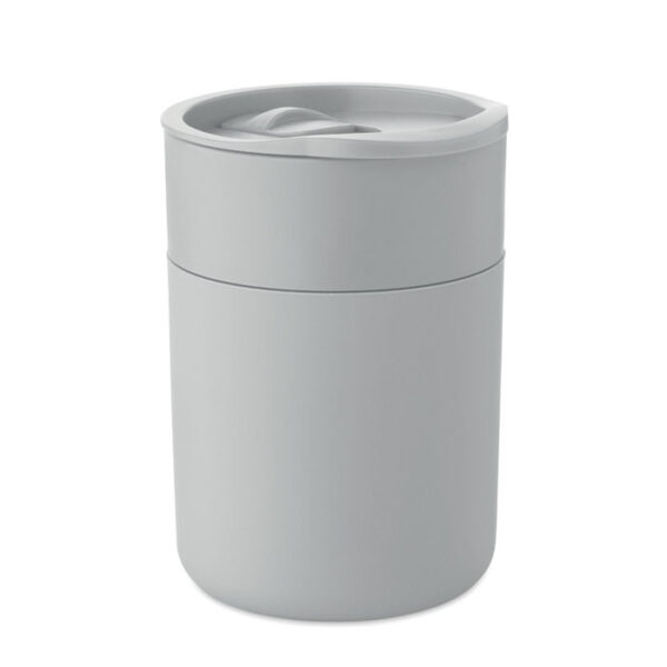 PP tumbler with silicone sleeve and PP sliding lid. Capacity: 330 ml. As this is a single walled mug, heat transfer can still occur.