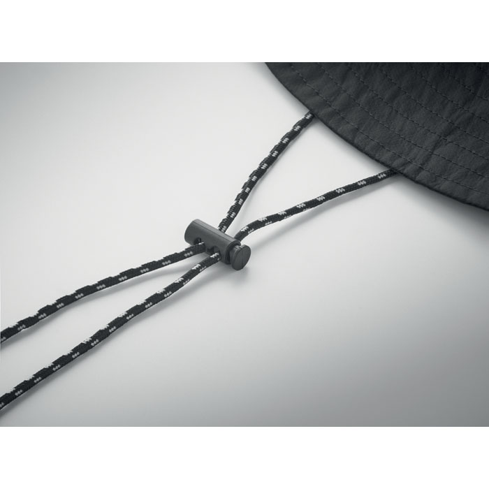 Water repellent fisherman hat made of polyester, includes self material pouch with ABS carabiner. 64 gr/m².